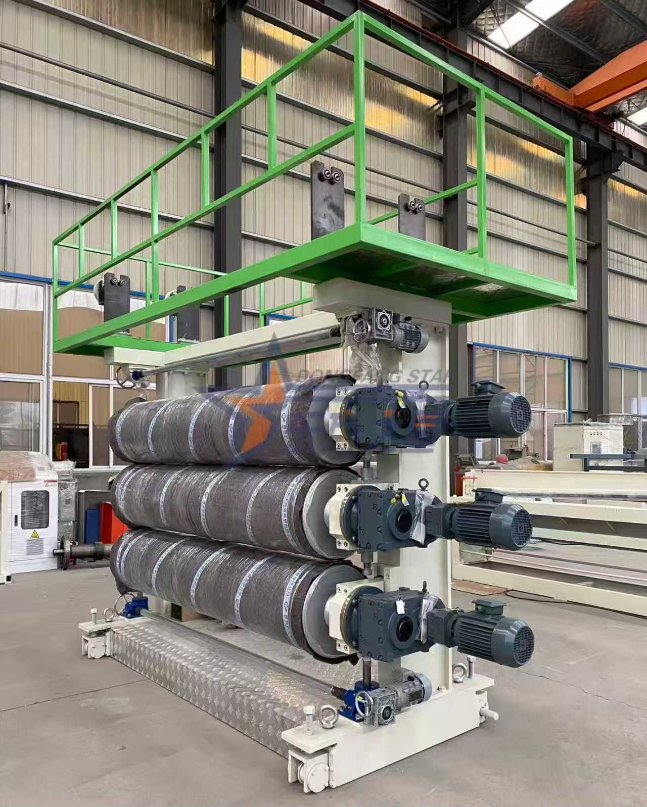 The ABS/HIPS levha üretim hattıQingdao EASTSTAR, büyük ölçekli ABS (hidrokarbon kopolimer) ve HIPS (yüksek mukavemetli etil akrilat) üretiminde uzmanlaşmıştır.çizgiyaklaşık 2.000 metre çapında ve eşit kalınlıkta (1-6 mm) levhalar üreten tek vidalı bir ekstruder J150-35/1'e sahiptir.The ekstrudertamamen Yüksek kaliteli nitrürlenmiş çelik 38CrMoAlA çelikten yapılmıştır ve bu iki hammaddenin çıktısının 400-600 kg/saat'e ulaşmasını sağlayan bir ABB frekans dönüştürücüyle donatılmıştır.