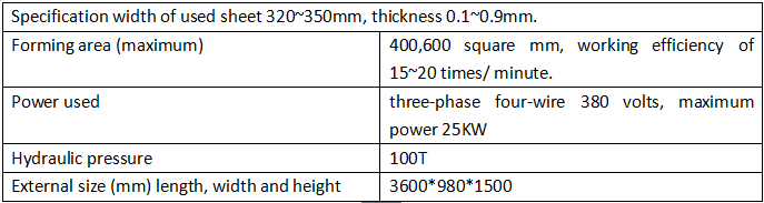 Fidanlık Tepsisi Ekim Yapma Makinesi teknik parametre Kullanılan tabakanın spesifikasyon genişliği: 300~320 mm, kalınlık: 0,8~2 mm. Şekillendirme alanı (maksimum): 400*600 mm, çalışma verimliliği 15~20 kez/dakika. Kullanılan güç: üç fazlı dört telli 380 volt, maksimum güç 25KW Hidrolik basınç: 100T Dış boyut (mm) uzunluk, genişlik ve yükseklik) 3600mm*980mm*1500mm