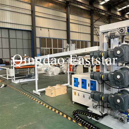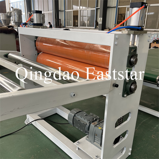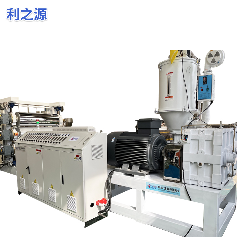 Yumuşak PVC kaymaz plaka ekstruder ekipmanı: Ekipman esas olarak tek vidalı bir ekstruder, üç silindirli bir kalender, 6 metrelik bir soğutmadan oluşur. braket, bir kauçuk rulo çekiş makinesi, bir kesme makinesi ve bir konveyör bant cihazı.